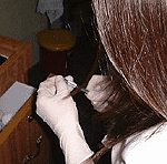 | 針先に墨を付けて。いよいよ、スタート。「いたいのかなぁ」の心配をよそに、むしろくすぐったいぐらいなんだって。 お姉さんの顔は真剣です。軽く、軽く針で、突っつくような感じで、まずは、眉毛の輪郭から色を入れていく。 |