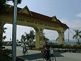 ・パンコール島 島内の移動は、タクシーかレンタルバイク。道路というと、海岸線を一周する道と中ほどを横切る道があり、ちょうど数字の「9」を作っているだけ。だから自家用車というのはほとんど見かけることがないのだ。何日か滞在すると道端やすれ違う人々の顔を覚えてしまいそうな親近感が島全体にある。地元の人たちもお互いにみんな顔なじみといった風 情が心を和ませる。島の南東はマレー人が住む漁村テロッ・ゲドゥン。1670年にオランダ人によって立てられた要塞の遺跡があり、乗合タクシーに乗った観光客がひっきりなしにやってくる。 ずっと走っていくとすぐにビーチに出るのだが、そこでは珍しいマレー人達の海水浴風景も見られる。全員が上下とも通常の衣服を着たまま。さらにあのマレー人女性のホッカムリをしてはしゃぐ姿は見ていて「そこまでするか」と声を上げさせる。(写真左) |