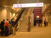 ゲートA、B、それからゲートCからのトレインから降りると、搭乗客はみな、各ゲート中央に位置するエスカレーターを下りて、イミグレーションへ向かう。(写真左) エスカレーターの乗り場には、「KLIA