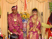 | 長老とおぼしき人が、周りのコンパンの音に合わせ、まさに歌うかの如く祈りの朗読をする。手作りでほのぼのとした中にイスラム世界の空気があふれ出てくるようなひととき。 | ちょっと緊張した式が終わると、ハスブラー君とノーマラさんは晴れて夫婦となり、近親者と共に結婚式の特別料理の席に着く。そして再び長い祈りを捧げ、新しい家族たちとの初の宴となる。この頃にはいつの間にか参列者たちはいなくなり、大活躍だったご近所さんたちも家の中でホッと一息をついているのだった。 |