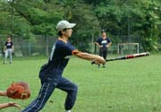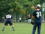 2002年はニッショウイワイを相手にコールド勝ちで終え、03年もそのまま勢いに乗って連勝を続けたいところ。HITACHI戦は今年1年を占う大事な試合だったが、展開はJalanJalanにとって極めて苦しいものだった。終始一点を争うシーソーゲームで、ひとつのエラー、一球の失投が勝敗を分ける息詰まる展開となった。HITACHIはここまで一勝もしていないが、強豪を含む全ての相手に接戦をしてきた、うるさく、しぶとい試合巧者。JalanJalanも楽には勝てないだろうという予測の中、この日は特にJalanJalanの打線が全くつながらず、試合終了まで予断を許さない流れとなった。また、HITACHIも6回の表、2アウト満塁の好機で決定打が出ず無得点、その裏、JalanJalan逆転のチャンスを与えてしまう結果となった。 JalanJalan、薄氷の勝利ながら、これで今シーズン開幕から5連勝。Aリーグ同じく全勝中のREDSと並び、リーグ勝ち点首位をキープしている。(写真は、しぶといHITACHI打線を相手に苦しむ投手、梅原) |