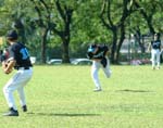 この試合、初めてユニフォームを着用し、選手として登録した民谷。「点差がついたら代打で!」という希望だったため、大差の付いた最終回、相馬のヒットを見届けた監督が代打指名に歩きかけた矢先、相馬が三塁前で刺殺され、チェンジ。初登場のチャンスは消えていった。 |