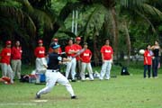 試合は、1回裏いきなり4点を先制され、苦しい展開。投手梅原は今季最高のピッチングで、REDS打線にヒットを許さないものの、味方守備の乱れもあり、不運な失点。それでも切れずに辛抱強くコーナーに速球を配し、REDS打線を抑え込む。一方、JalanJalan打線もじわじわと加点し、追い上げる展開。途中、REDSエースをノックアウトし、最終回も走者を溜めながら2番手投手を攻め続け、一打逆転と迫ったが、 2死満塁、櫛山の打球はファーストのグラブにライナーで収まり、雪辱戦はあと一歩で涙を飲むこととなった。 (写真は、勝利の瞬間にピッチャーマウンドに集まり喜び合うREDSナイン) |