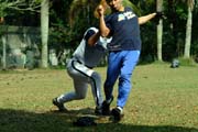 初回まずまずの先制をしながら、2回は三者凡退に終わり、また苦しい試合展開かと思わせたが、3回から次第に打線が調子に乗り、5回までに5打席目が回るつるべ打ち。2回から立ち直った梅原もその後ミツイ打線をほぼ完璧に抑え、5回コールド勝ち。(ピッチャー前バントを処理する梅原。後方はサード小澤) |