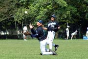 | レフト線ファールフライを惜しくも捕逸。 太陽とサッカーゴールが悔しい松原。 |